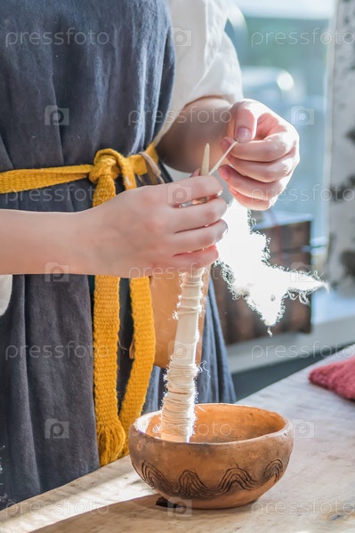 Женщина в традиционной русской одежде плетет веретено
