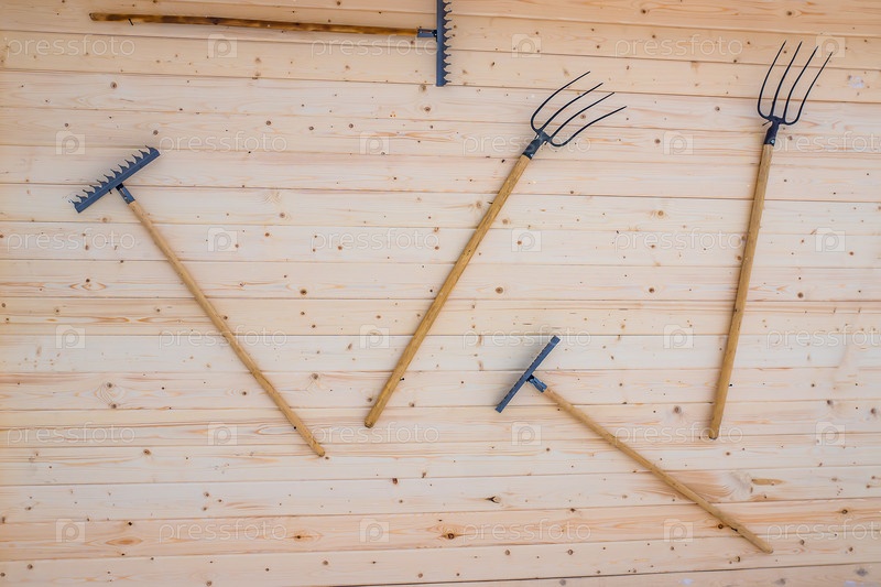 Вилки и грабли висят на деревянной стене
