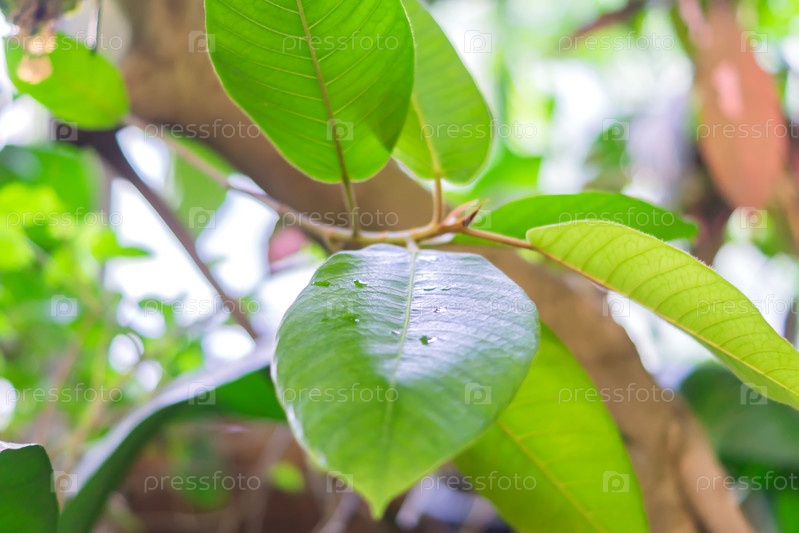 Тропическое дерево крупным планом, ветка с зелеными листьями