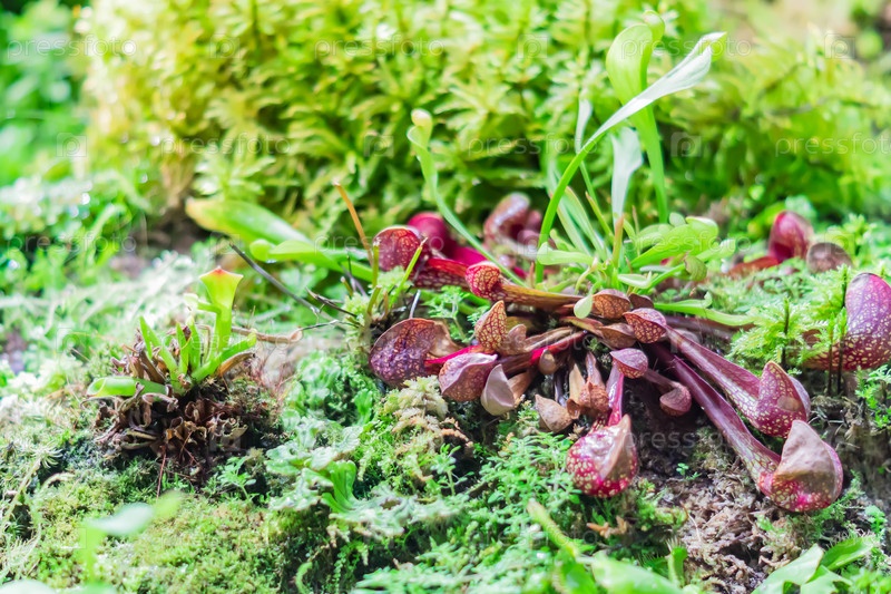 Крупный план плотоядных растений, мухоловка в тропическом лесу