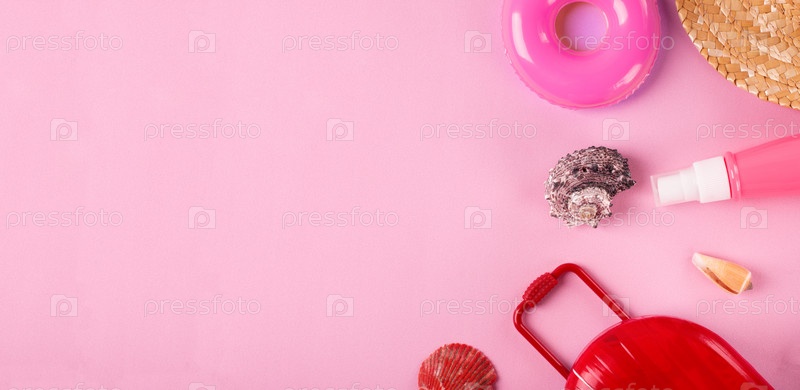 Веб-баннер с чемоданом, надувным кольцом для плавания, солнцезащитным спреем и морскими раковинами. Макет пляжного отдыха с копией пространства на розовом