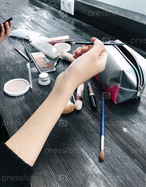 Черная кисть в руках девушки лежит на столе серого цвета в полоску рядом с косметичкой