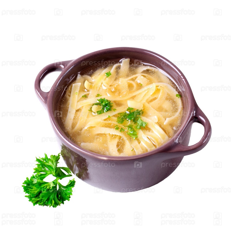 Изолированный куриный бульон с яичной лапшой, подаваемый в маленькой кастрюле на белом