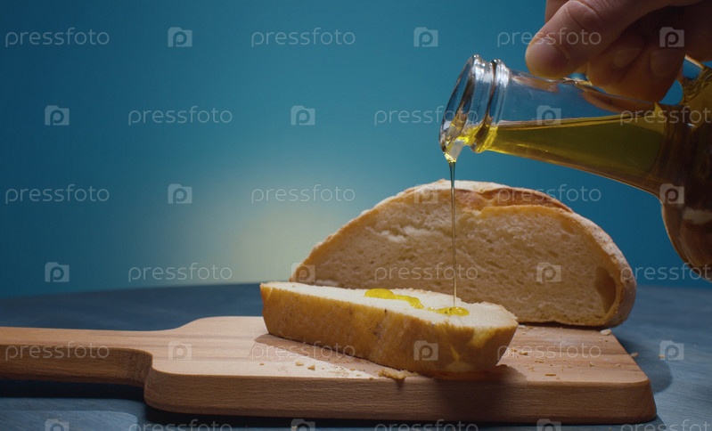 Наливая оливковое масло на кусок хлеба