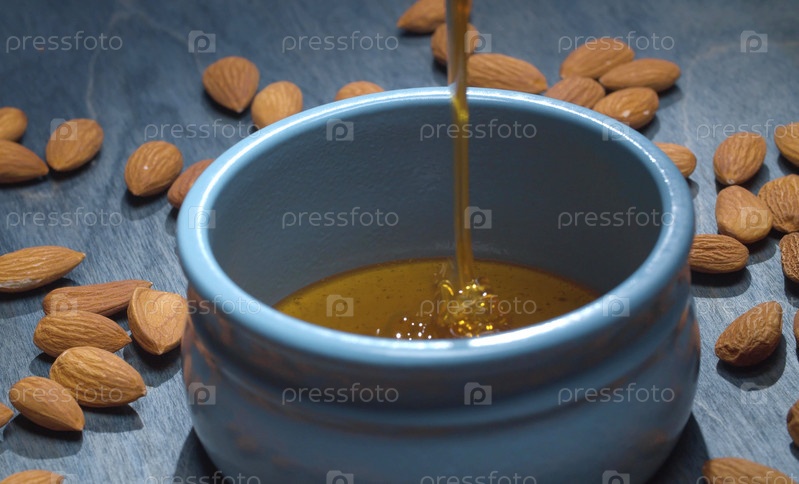 Свежий мед, наливающий в миску и миндальные орехи на синем фоне. Концепция здоровых свежих продуктов