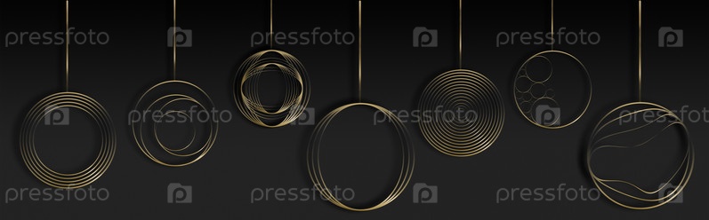 Елочные шары в золотой гамме с разными абстрактными узорами на черном фоне. Баннер для оформления сайтов и блогов