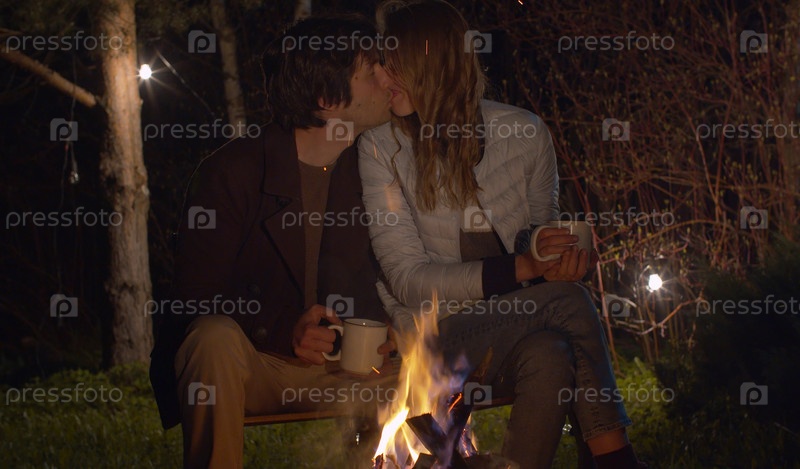 Молодая семья ночью сидит у костра