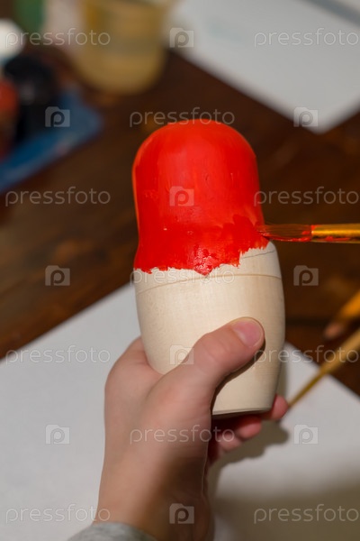 Маленькая девочка раскрашивает русскую матрешку по имени матрешка зеленой краской