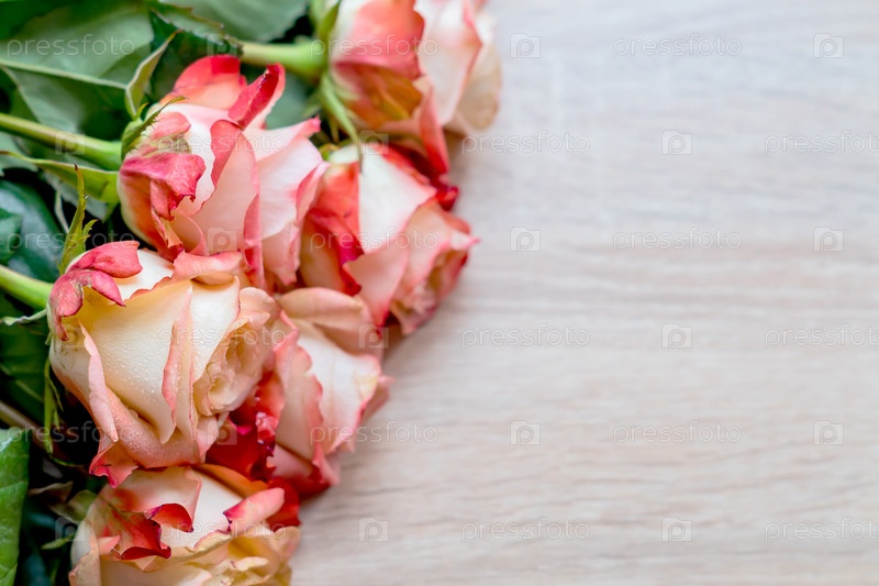 Букет роз на деревянный стол. Цветочный фон с копией пространства