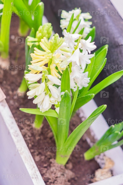 Белые цветущие цветы гиацинта в белом деревянном горшке