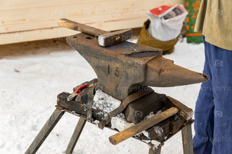 Кузнец вручную кует расплавленный металл на наковальне под открытым небом