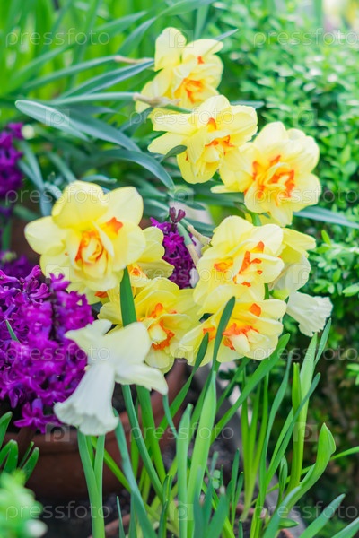 Желтый нарцисс гиацинт на фоне зеленых листьев