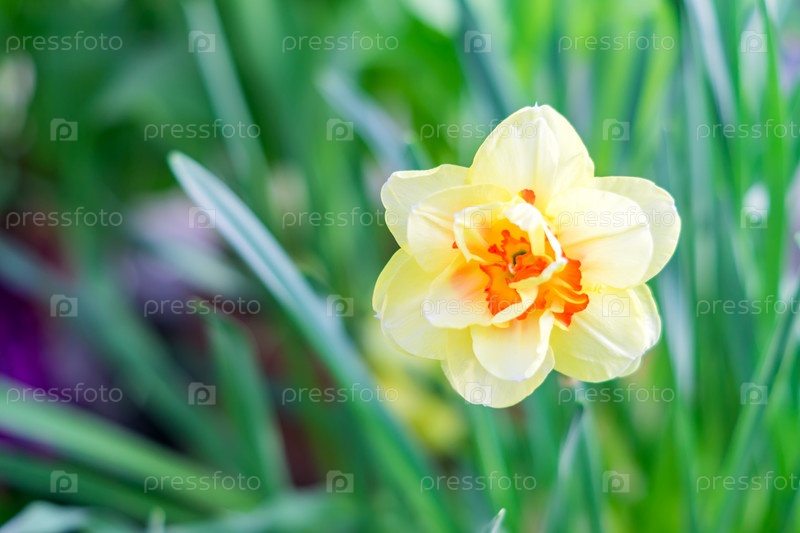 Желтый нарцисс на фоне зеленых листьев