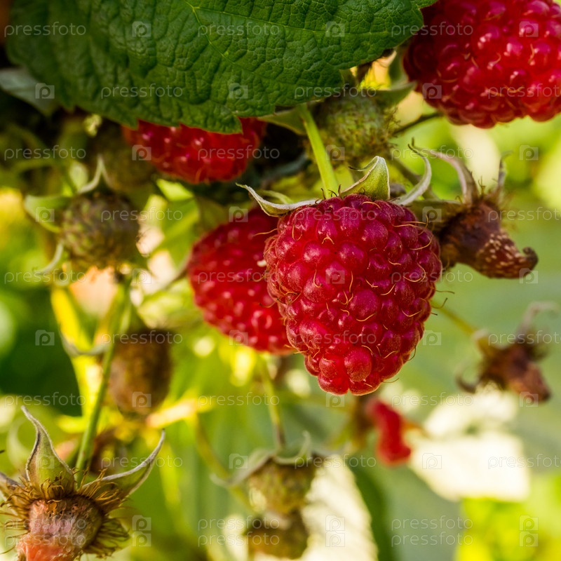 Спелая малина на ветке, сбор урожая летом в саду