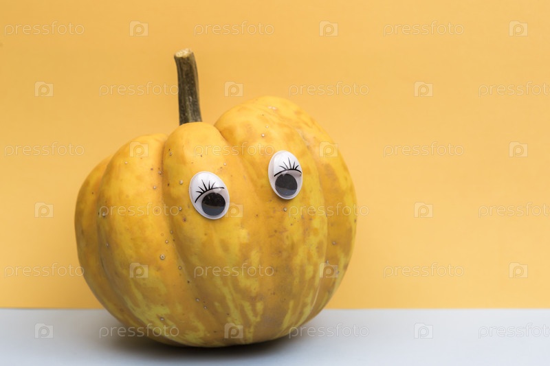 Забавная перезрелая тыква с глазами на оранжевом фоне