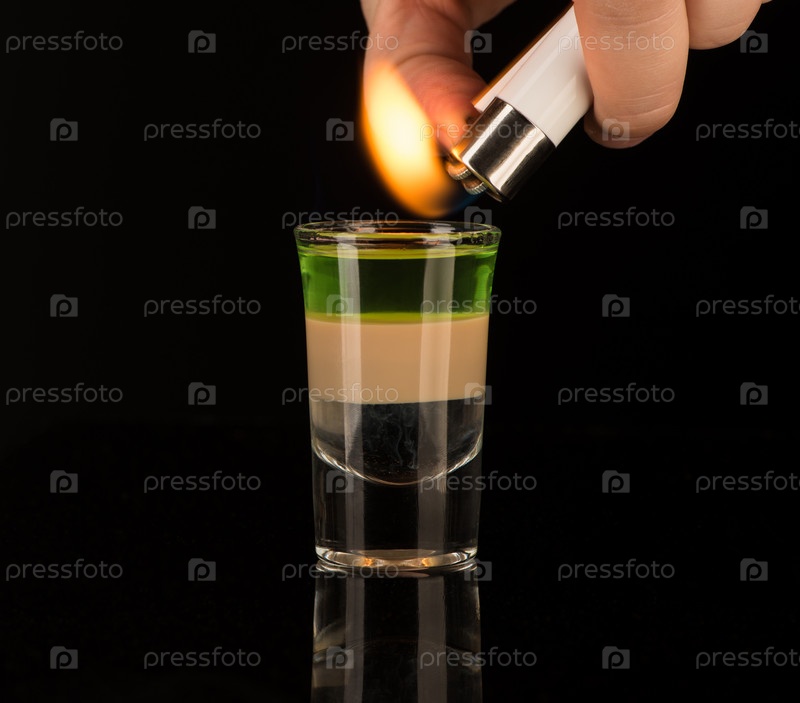 Бармен поджигает смешанный алкогольный коктейль в рюмке, крупным планом