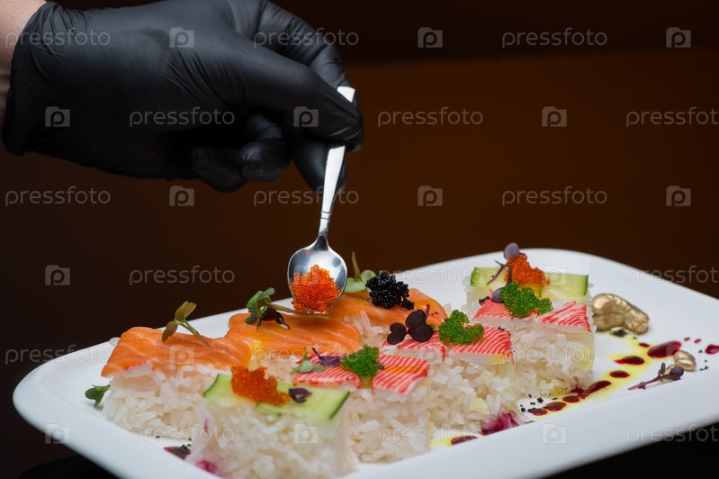 Шеф-повар украшает суши икрой. процесс приготовления суши