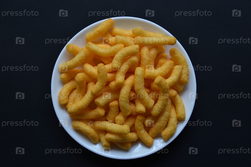 Кукурузные чипсы с солью и перцем на белой тарелке. Вкусный завтрак из кукурузных чипсов на черном фоне
