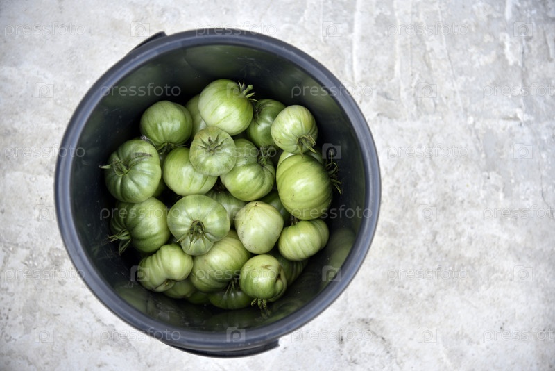 Красивые зеленые помидоры в черном ведре днем на сером фоне. Сбор зеленых помидоров в летнем саду