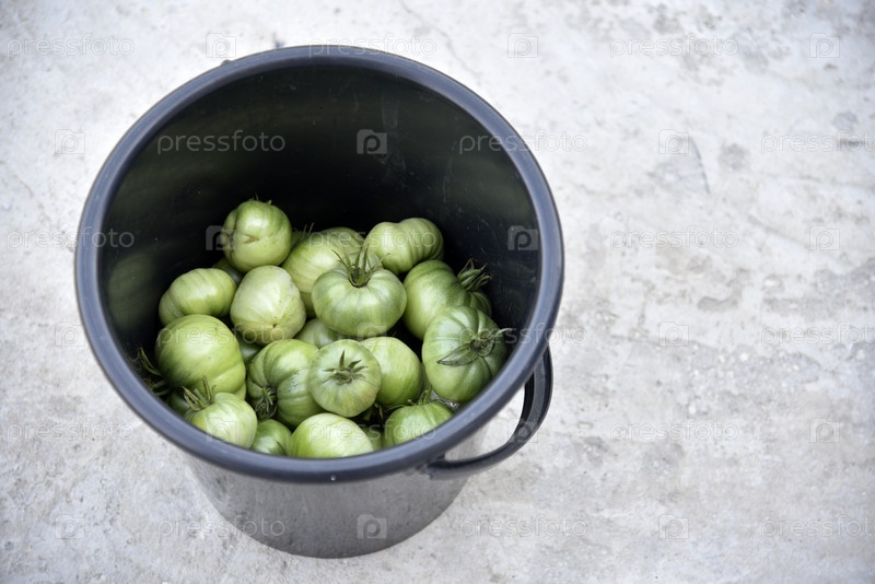 Красивые зеленые помидоры в черном ведре днем на сером фоне. Сбор зеленых помидоров в летнем саду
