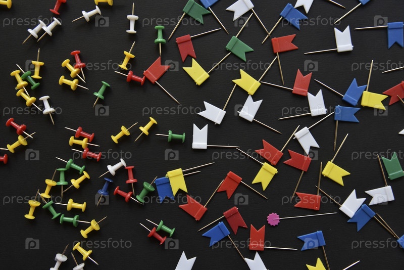 Разноцветные пластиковые кнопки питания на черном фоне. Красивые канцелярские кнопки крупным планом