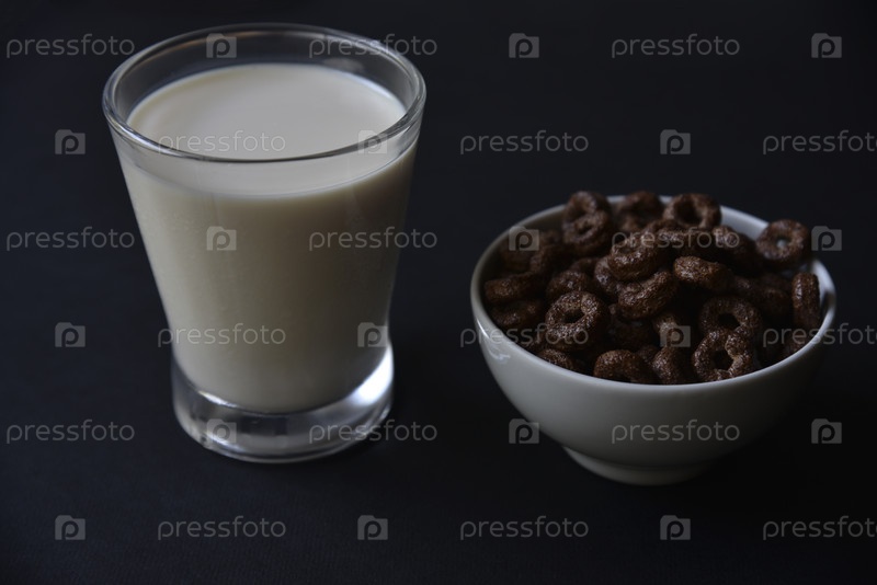 Стакан молока на черном фоне и шоколадные кукурузные кольца. Вкусный завтрак из кукурузных хлопьев и молока