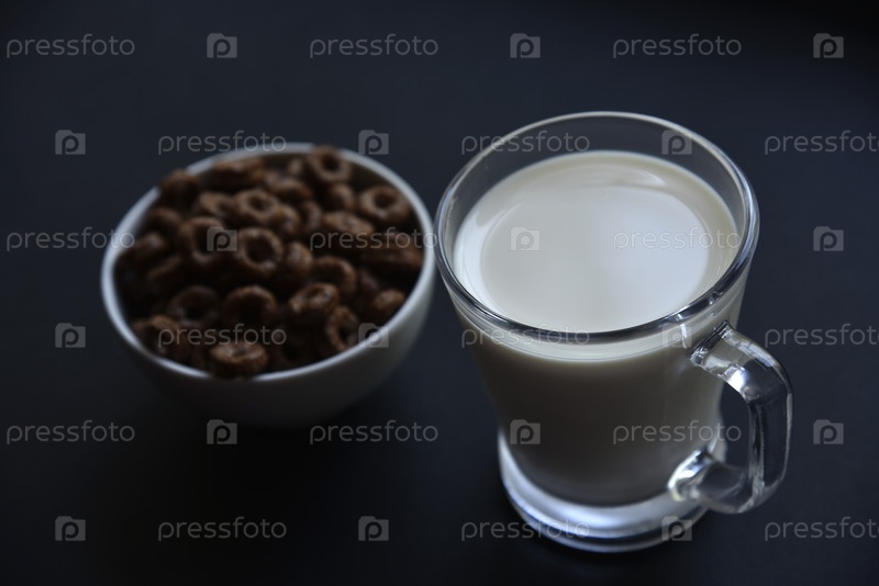 Стакан молока на черном фоне и шоколадные кукурузные кольца. Вкусный завтрак из кукурузных хлопьев и молока