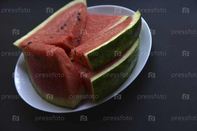 Сочные и сладкие кусочки арбуза на белой тарелке. Нарезанный красный арбуз крупным планом