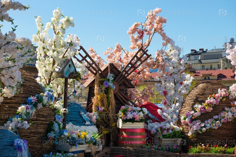 Сквер у Храма, украшенный цветами и фигурками к Пасхе