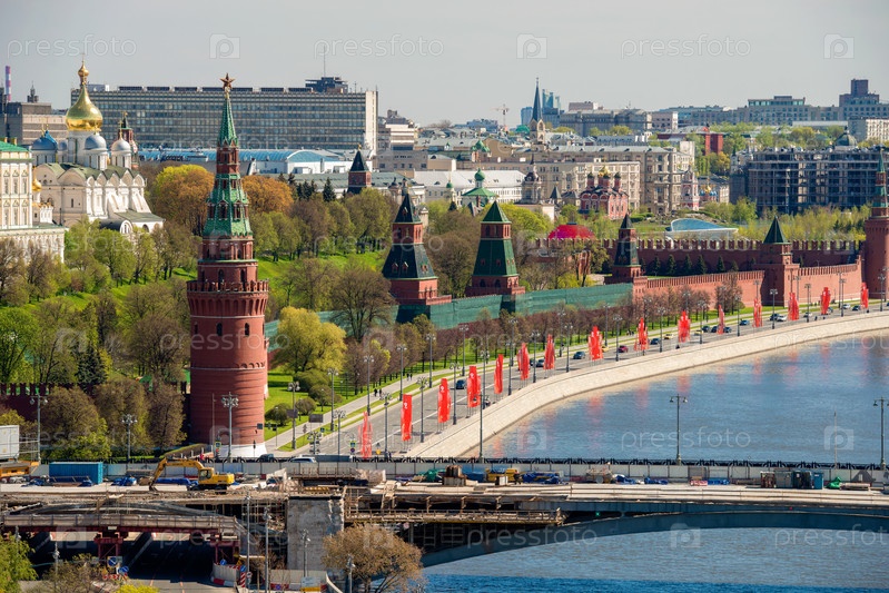 Вид с воздуха на Московский Кремль, Москву-реку и набережную Кремля в весенний день