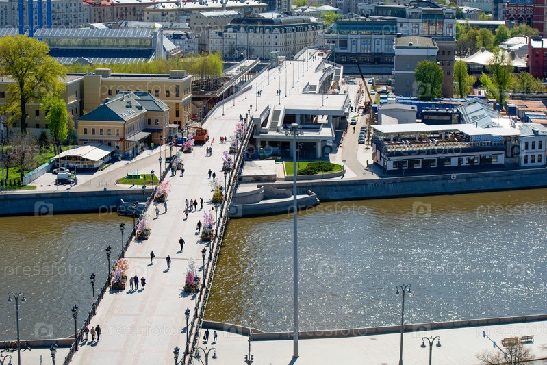 Москва, Россия - 10 мая 2021 г.: Вид с вершины пешеходного Патриаршего моста через Москву-реку и Водоотводный канал