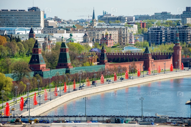 Вид с воздуха на Московский Кремль, Москву-реку и набережную Кремля в весенний день