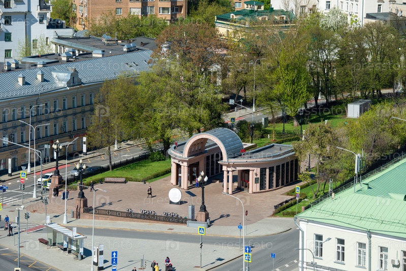 Москва, Россия - 10 мая 2021 года: Вид сверху на вестибюль станции метро "Кропоткинская" на площади Пречистенские ворота, в начале Гоголевского бульвара