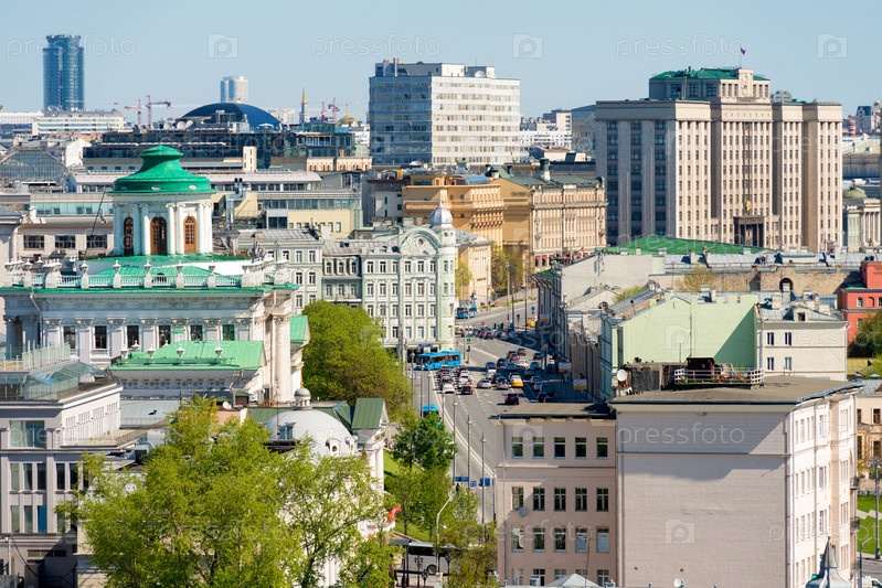 Вид сверху на крыши жилых домов в районе Арбата и автомобильный трафик на Моховой улице, Москва