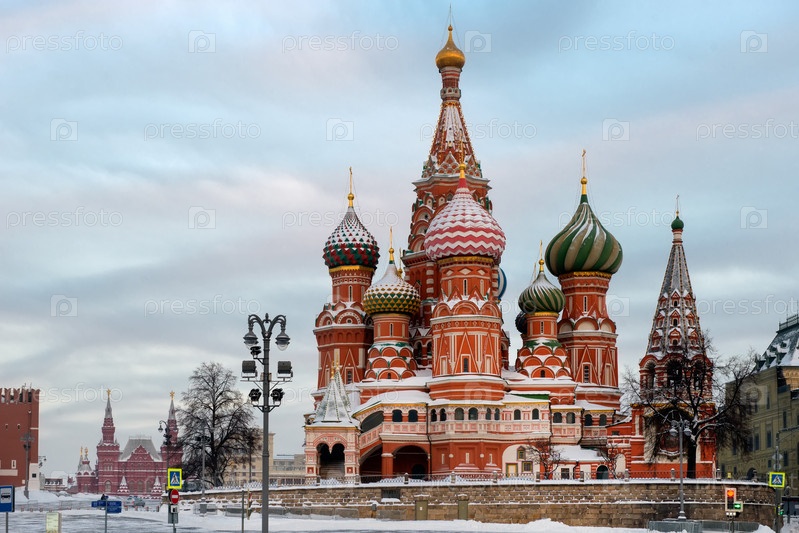Москва, Россия, Красная площадь, вид на собор Василия Блаженного морозным зимним утром