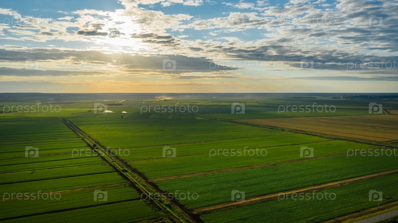 Живописные ряды сельскохозяйственных полей на летней ферме вечером. Аэрофотосъемка, вид сверху с дрона. Сельскохозяйственный район Московской области. Аграрная земля в летнее время. Красота земли
