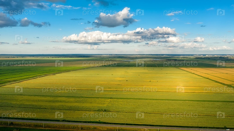 Живописные ряды сельскохозяйственных полей на летней ферме вечером. Аэрофотосъемка, вид сверху с дрона. Сельскохозяйственный район Московской области. Аграрная земля в летнее время. Красота земли