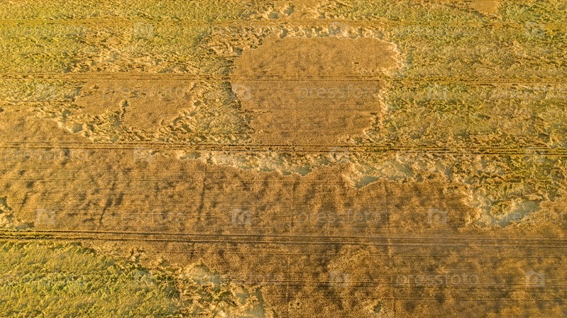 Живописные ряды сельскохозяйственных полей на летней ферме вечером. Аэрофотосъемка, вид сверху с дрона. Сельскохозяйственный район Московской области. Аграрная земля в летнее время. Красота земли