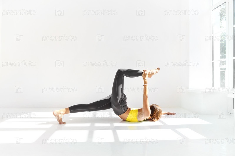 Гибкая женщина занимается йогой дома