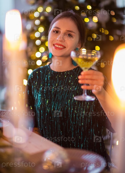 Женщина в праздничном наряде держит бокал с шампанским