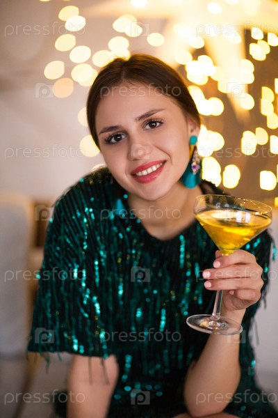 Женщина в праздничном наряде держит бокал с шампанским