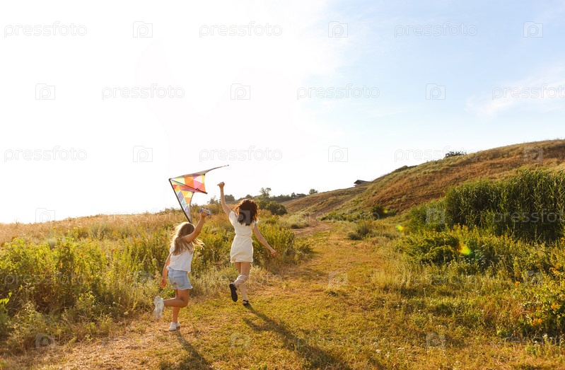 Мать и дочь играют с воздушным змеем