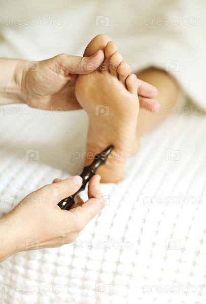 массажистка делает массаж ступней клиенту