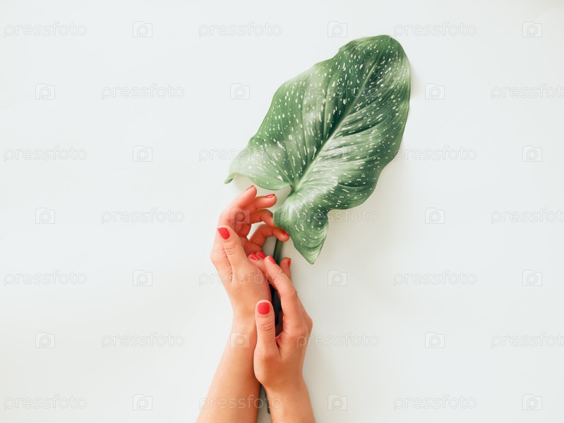Женщина со свежим листом, показывающая маникюр