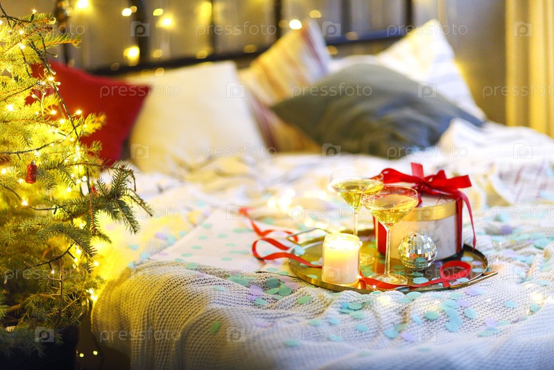 Подарок и украшения на кровати во время празднования Рождества