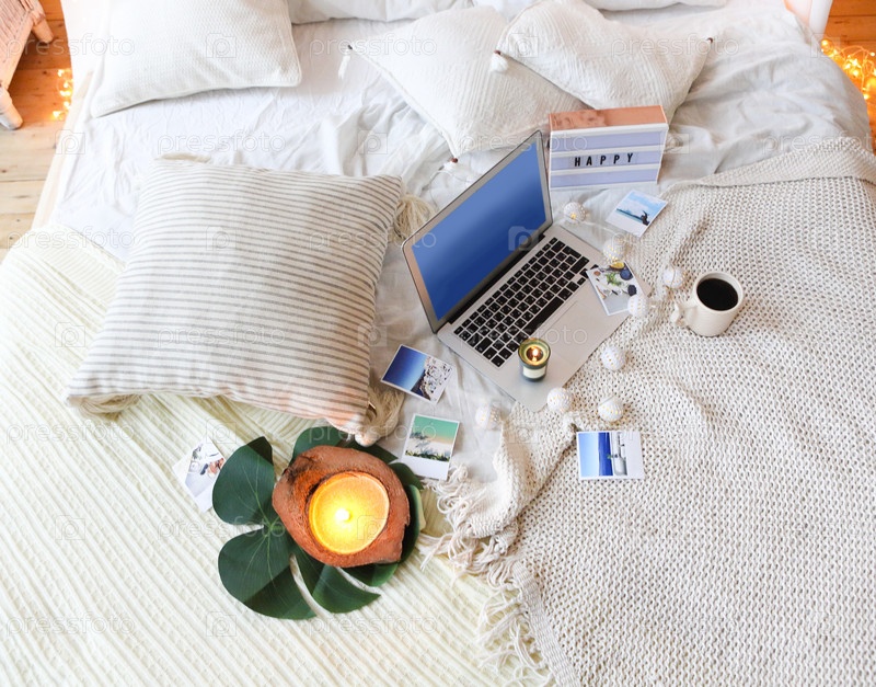Фотографии поездки и горячий напиток возле ноутбука на кровати