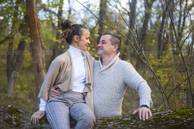 Красивая пара сидит на дереве в парке и обнимается