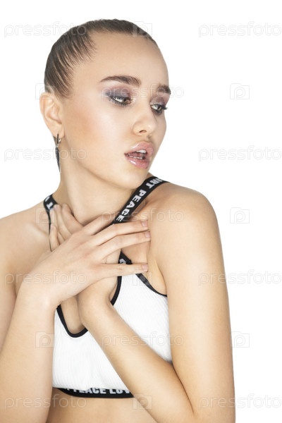 Портрет красоты. Красивая брюнетка в укороченном топе с идеальной свежей кожей