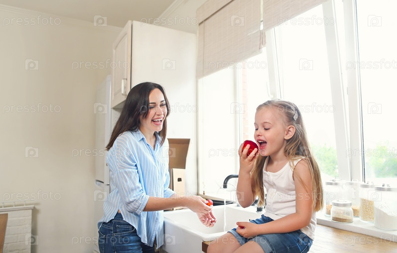 Красивая маленькая девочка с мамой на кухне моют и едят свежие фрукты