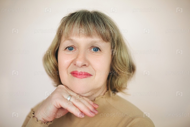 Улыбающаяся зрелая женщина трогает лицо в студии
